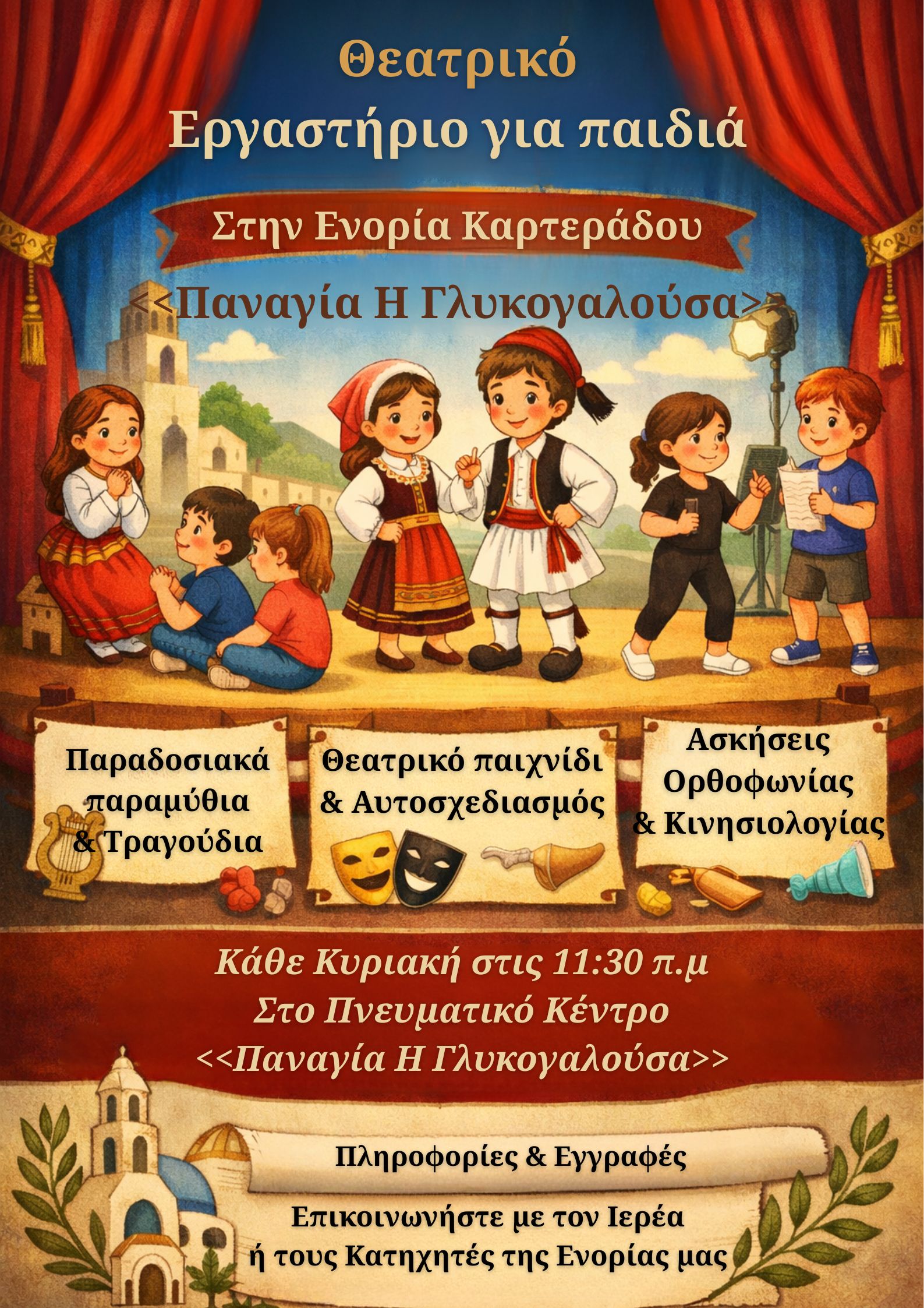 Η ενορία Καρτεράδου «Παναγία η Γλυκογαλούσα» με χαρά ανακοινώνει τη δημιουργία Θεατρικού Εργαστηρίου για παιδιά, με στόχο την καλλιέργεια της δημιουργικότητας, της συνεργασίας και της ελεύθερης έκφρασης μέσα από την τέχνη του θεάτρου, σε ζωντανή σύνδεση με την ελληνική παράδοση. Σε μια εποχή όπου τα παιδιά χρειάζονται δημιουργικές διεξόδους και ουσιαστικά ερεθίσματα, το θεατρικό εργαστήριο φιλοδοξεί να αποτελέσει έναν χώρο χαράς, μάθησης και προσωπικής ανάπτυξης.